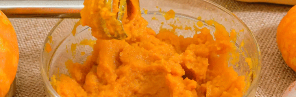 2. Préparer la pulpe : Une fois la citrouille refroidie, grattez la chair avec une cuillère et passez-la au presse-purée pour obtenir une consistance lisse.